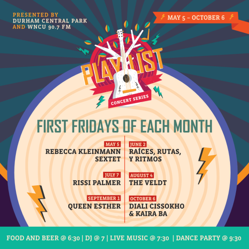 PLAYlist is a free concert series presented by Durham Central Park and WNCU 90.7FM. The concerts take place on the first Friday of the month from May to October. Curated lineup covers an eclectic blend of genres and features local, regional and national artists. In addition to the music, there is a mix of local food trucks, craft beer and other vendors. Open lawn seating so bring your blankets and lawn chairs.